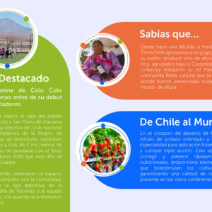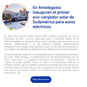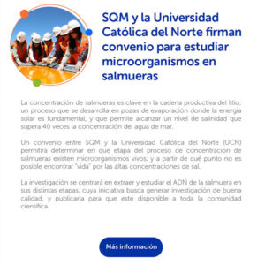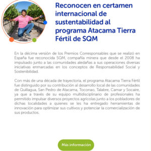 | ID del attachment: 10444 Título del attachment: ADN Sostenible URL del attachment: https://sqm-ynv.com/wp-content/uploads/2024/05/ADN-Sostenible.webp ![]() | ID del attachment: 10445 Título del attachment: Miradas Compartidas URL del attachment: https://sqm-ynv.com/wp-content/uploads/2024/05/Miradas-Compartidas.webp ![]() | ID del attachment: 10446 Título del attachment: Potenciando la Educación en el Norte de Chile URL del attachment: https://sqm-ynv.com/wp-content/uploads/2024/05/Potenciando-la-Educacion-en-el-Norte-de-Chile.webp ![]() |